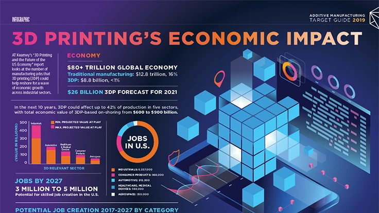 In the next 10 years, 3DP could affect up to 42% of production in five sectors, with total economic value of 3DP-based on-shoring from $600 to $900 billion.