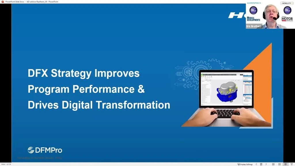 Digital technology is reshaping the design for manufacturing business. Specifically, Aerospace and defense companies require transformation operations to effectively compete. Digital engineering accelerates research and development and improves manufacturing processes while reducing costs. DFMPro is a design for manufacturing solution that provides defense and aerospace manufacturers a process-driven approach to digitally transformation. With DFMPro, engineering teams make informed design decisions by identifying downstream manufacturing issues in, assembly, quality, serviceability (DFx) early in the design process, thereby reducing overhead with improved design quality and improving time to market.