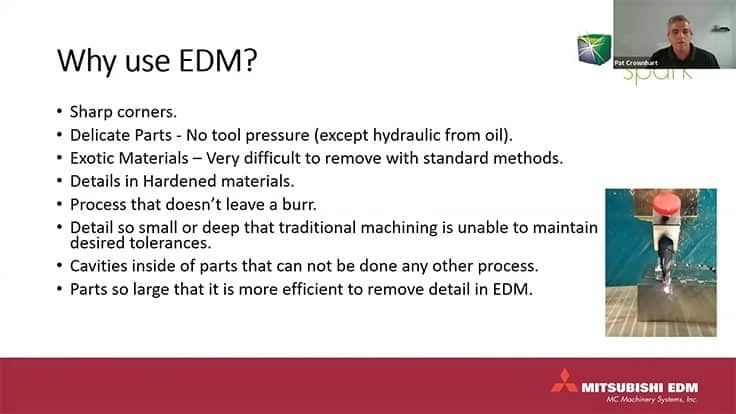 Pat Crownhart, sinker EDM product manager at MC Machinery Systems Inc./Mitsubishi EDM discusses basics and new developments in EDM.