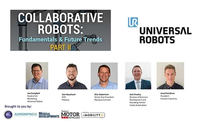 Joe Campbell, head of Americas marketing and applications development for Universal Robots discusses cobots with a lively panel of enthusiasts: Sam Bouchard, CEO of Robotiq Inc. Silas Robertson, Senior Vice President, Sales & Marketing for Olympus Controls Josh Pawley, founding partner of Vectis Automation and leads Vectis’ business development and application engineering teams Jared Sandman, the President of Fancort Industries