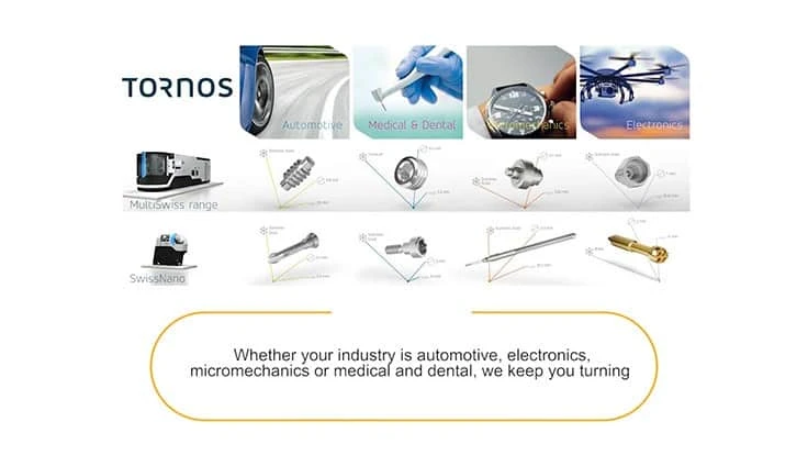Tornos, a global leader in the production of Swiss-type automatic lathes and multi-spindle machines, started in 1880 and marked the beginning of Swiss-type lathe technology. Backed by a 125-year legacy of expertise, attentiveness to detail, innovation, and reliability, Tornos offers unique solutions to customer challenges and applications in a wide range of market segments, such as, Automotive, Medical, Micro mechanics, and Electronics.