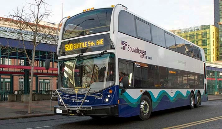 An Alexander Dennis double-deck bus transports passengers in Seattle, Washington. The company is working with electric commercial vehicle provider Proterra to make an electric double decker for Los Angeles County.