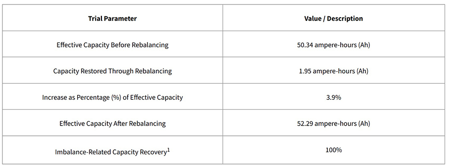 The trial marks the first real-world application of Prototype 2.0, validating the company’s proprietary rebalancing technology outside of controlled laboratory environments. The results demonstrated 100% recovery of imbalance-related capacity loss, confirming Prototype 2.0’s ability to rebalance cell-level voltages and restore usable ampere-hour capacity in aging battery packs.