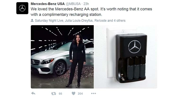 On Twitter, company officials say the AA Class, powered entirely by store-purchasable AA batteries, will come with a Mercedes-branded charger that customers can plug into standard 110V wall outlet.