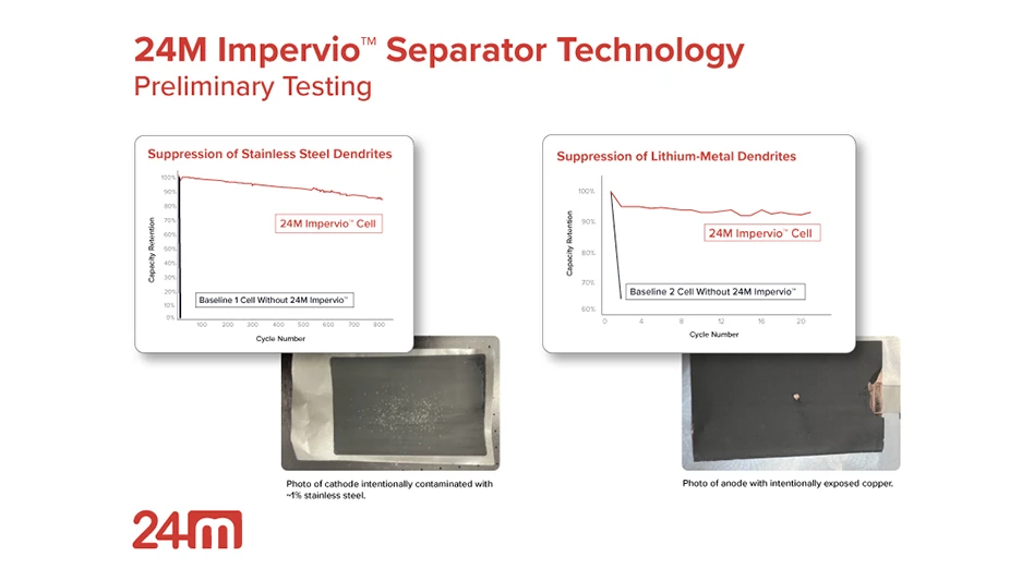 24M unveiled a transformative new battery separator — 24M Impervio — that promises to redefine battery safety for electric vehicle (EV), energy storage systems (ESS) and consumer applications. This proprietary technology enables unprecedented safety advancements for lithium-ion and lithium-metal batteries that will facilitate the prevention of catastrophic fires and massive recalls caused by metallic dendrites (i.e. dendrites from metal contamination introduced during the production process), electrode misalignments or lithium dendrites. 24M Impervio achieves these results by obstructing metallic dendrite formation, as well as by measuring battery performance thereby enabling early fault detection.