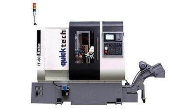 Quicktech i-42 ROBO and i-60 ROBO 4-axis mill/turn centers feature integrated 6-axis Mitsubishi robots for fast, automated loading and unloading of medium-diameter (i42: 42mm/1.68", i60: 60mm/2.36") bar stock. In addition to carrying out turning, the machines can perform complex milling with standard live tools. An optional 360° B-axis further extends milling capabilities.