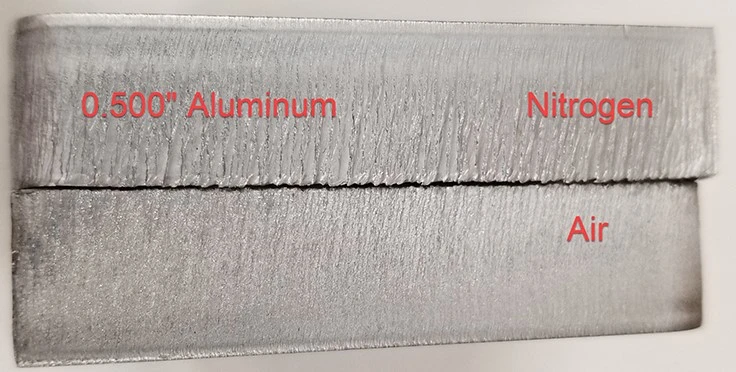 When used in aluminum applications, high pressure dry air produces virtually dross-free cuts while gaining up to 150% increases in speed on 1/8” thick aluminum. The low cost of air and speed of the operation makes this an excellent choice for any fabricator processing aluminum.