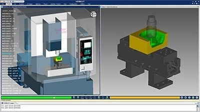 Machine simulation with VERICUT detects collisions and near-misses between all machine tool components such as axis slides, heads, turrets, rotary tables, spindles, tool changers, fixtures, workpieces, cutting tools, and other user-defined objects. Users can also set up ‘near-miss zones’ around the components to check for close calls, and detect over-travel errors. Machine movements can even be simulated while stepping or playing backwards in VERlCUT‘s Review Mode.