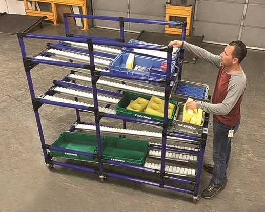 The Creform flow rack can be part of a supermarket storage area. It is ideal for picking individual SKUs that make up a manufacturing kit, typically appropriate for assembly applications. The flow rack can be used for general storage of pull-to-ship parts and point of use presentation rack within an assembly work cell.