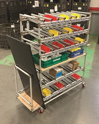 Creform Corporation, a manufacturer of unique products for material handling and commercial structures, has designed, built, and fully assembled a new mobile flow rack that holds components and hardware for a building products manufacturer’s operation. With five levels of gravity flow conveyor to hold small bins of hardware and supplies, each lane features side guides to hold the bins securely in place. The gravity flow ensures first in/first out (FIFO) material usage, while the 4° angle of the flow lanes helps the containers flow, keeping them toward the front for picking ease. The cart enhances the user’s ability to see the parts they are accessing. To further enhance the cart, each lane features label holders for part identification.