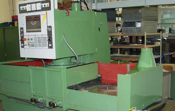 High productivity CNC-double rotary table grinding machine with two axes for grinding flat or conical surfaces on a great variety of parts such as table-knives, insides of stamped scissors, wood chisels, spatulas or connecting rods