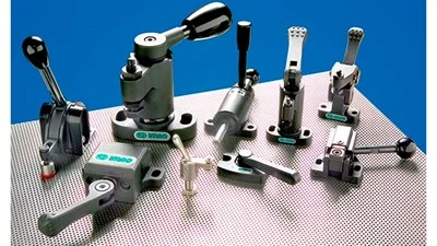 One-Touch clamps include; retractable versions, with clamping force to 945 lb, that pivot completely away from the workpiece for easy loading/unloading; thrust clamps, with clamping force to 315 lb, that feature a clamping body and bar used together for a range of workholding options; and snap clamps, with clamping force up to 31 lb, that provide a unique snap-on system. Once the handle is moved forward the internal mechanism works to build tension. At a specific point, the tension is released and transformed into clamping force.