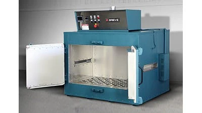Round Lake, Illinois – No. 1020 is a 500°F (260°C) vertical airflow cabinet oven from Grieve, currently used for pass-thru heat processing with a customer’s conveyor system. Workspace dimensions of this oven measure 44" x 24" x 24". 10kW are installed in Incoloy sheathed tubular heating elements, while a 1,000cfm, 1hp recirculating blower provides vertical downward airflow to the workload.