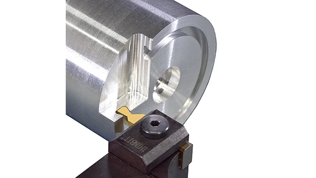 THINBIT, manufactured by Kaiser Tool Company, has an expansion to its Groove ’N Turn line of dovetail grooving inserts. Dovetail grooving inserts are used to machine O-ring dovetail grooves with 66° undercut angles. The insert design is optimized for strength by utilizing an insert pair to generate the groove form. Insert sizes are 0.030", 0.050", 0.060", 0.070", 0.080", 0.090", 0.100", 0.125", and 0.150" with major diameters starting at 0.300". Available in sub-micron grain carbide grades for ferrous and non-ferrous materials either uncoated or with TiN, TiCN, TiAIN, or diamond film coatings. Groove ’N Turn dovetail inserts can be used on conventional, Swiss and CNC machines.
