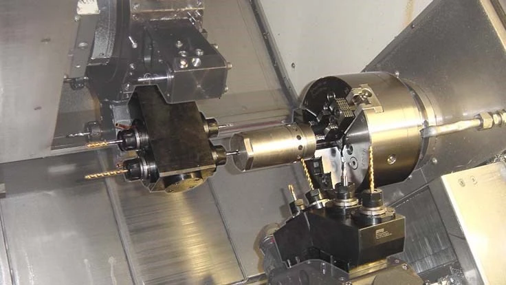 The utilization of the Z-Axis is even more effective. On a two-spindle machine, two tool holders for the main spindle and two tool holders for the sub-spindle are used. A complex work piece can be machined with tool capacity left over. When utilizing all the tool spaces to the maximum, the machine can be equipped with up to 72 tools, drastically increasing machine production capability, reducing downtime and overall production costs.