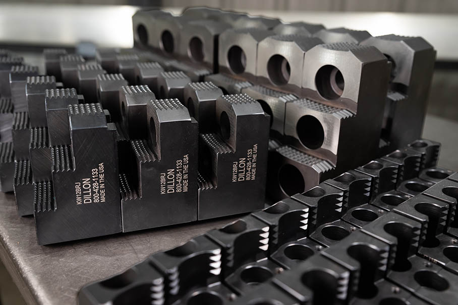 The jaws are manufactured of 8620 case hardened steel with ground locating surfaces, and black oxide coated for corrosion resistance. Dillon also offers custom made special or modified hard jaws.