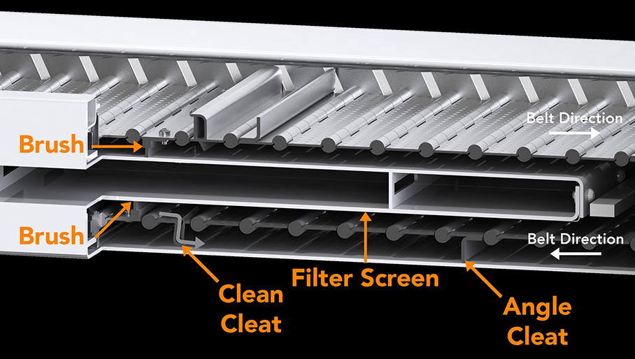 Jorgensen also offers an EcoFilter 200 option for filtration of fine chips to 200μ. Both EcoFilter options fit a standard conveyor envelope and can be retrofitted on Jorgensen EcoFilter-Ready conveyors.