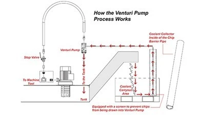 Cincinnati, Ohio – Removing coolant that naturally accumulates in a chip hopper enables longer production runs, eliminates messy cleanouts and reduces coolant costs. A new venturi pump kit from LNS makes the process of removing coolant from chip hoppers virtually effortless.