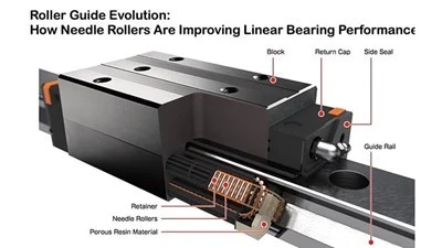 NB Corporation's EXRAIL linear guide has more rollers in less space than other linear bearings, which increases load capacity and disperses the load more evenly. It has longer rollers for greater contact surface and less contact pressure.