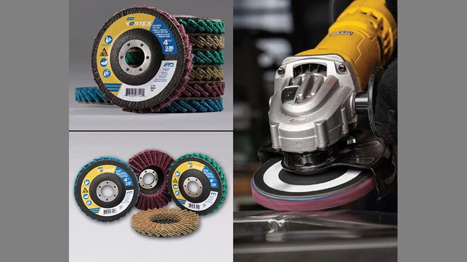 Saint-Gobain Abrasives, one of the world’s largest abrasives manufacturers, introduced the Norton Vortex Rapid Prep Non-Woven Flap Discs lasting longer and producing significantly increased cutting rates and smear-free finishes simultaneously. Norton patented Vortex agglomerated aluminum oxide grain technology enables the cutting power of a coarser grit while producing a finer finish in one abrasives disc solution. The company reports based on tests performed, the new non-woven discs can increase material removal rates (MRR) more than 50% compared to non-woven medium grit flap discs.