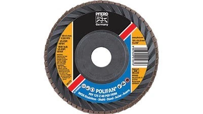 Milwaukee, Wisconsin – PFERD Inc.’s POLIFAN PSF Z-TRIM (PFE-121A) universal flap discs have a light weight composite backing that can be trimmed to extend service life and reduce time-consuming disc changes. The composite backing and flap arrangement reduce vibration and noise levels. Produced with a higher density of zirconia-coated material (Zirconia alumina Z) than standard PSF flap discs, these discs provide an improved surface finish and cushioned, contamination-free grinding in surface grinding, weld grinding, blending, chamfering, and deburring on steel and stainless steel (INOX).