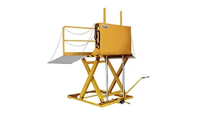 They are available in 3,000 lb, 4,000 lb, and 5,000 lb capacities. Platforms are constructed of safety tread steel plate and are available in 72” x 72” or 72” x 96” sizes with a variety of transfer configurations. They also feature safety chains at either end and a removable hand rail.
