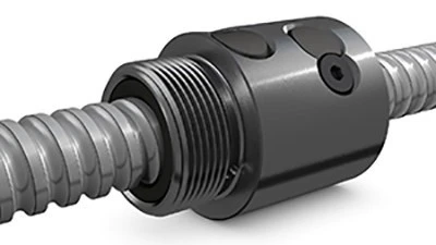 Among key design features, a ball recirculation path allows balls to be picked up and recirculated smoothly for quieter and faster operation up to 15,000rpm, depending on ball diameter. Optimized and compact nut geometry significantly reduces noise and is less sensitive to misalignment. An ideal thread profile and specialized surface finish technology contribute enhanced running and reliability characteristics. A threaded nose promotes easy mounting and a lubrication hole is standard for accessible greasing.
